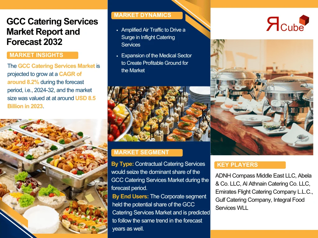 According to The Report Cube latest research study, The GCC Catering Services Market is projected to grow at a CAGR of around 8.2% during the forecast period, i.e., 2024-32, and the market size was valued at at around USD 8.5 Billion in 2023.