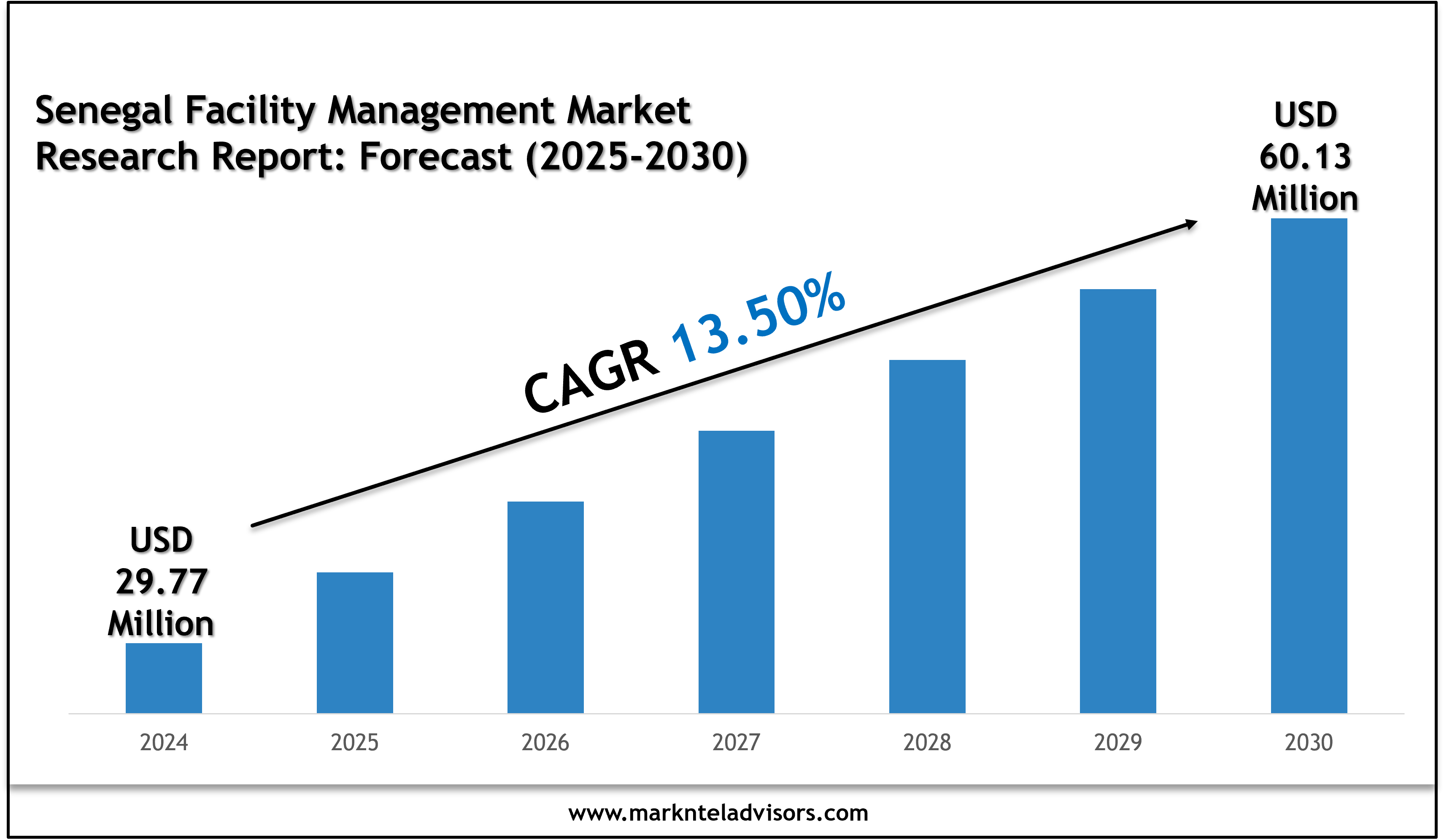 The Senegal Facility Management Market size was valued at around USD29.77 million in 2024 and is projected to reach USD60.13 million by 2030. Along with this, the market is estimated to grow at a CAGR of around 13.50% during the forecast period, i.e., 2025-30. Various factors, including technological advancements, infrastructural developments, and economic reforms, are influencing the market growth of facility management in Senegal. Senegal has planned ambitious residential and public infrastructure developments under the "Plan for an Emerging Senegal". The program's agenda is to transform Senegal into an emerging economy by 2035. The projects under the program will include the construction and expansion of corporate parks, airports, hotels, and more. These developments are going to significantly boost the demand for facility management services, encompassing maintenance, security, and operational efficiency.