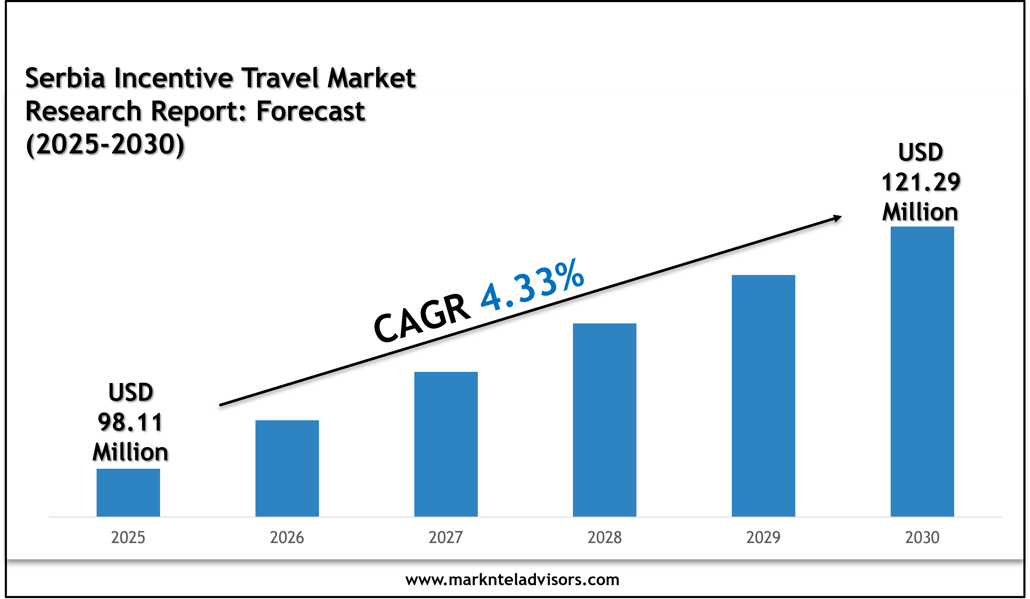 The Serbia Incentive Travel Market size is valued at around USD 98.11 million in 2025 and is expected to reach USD 121.29 million by 2030. Along with this, the market is estimated to grow at a CAGR of around 4.33% during the forecast period, i.e., 2025-30. The market growth is driven by Serbia’s strategic focus on tourism development and the increasing recognition of it being an attractive destination as a corporate reward. Also, the government has prioritized tourism as well as Meetings, Incentives, Conferences, and Exhibitions (MICE), which is a type of business tourism in which groups, often planned well in advance, are brought together for professional, commercial, or networking purposes for economic and social growth. This dedicated strategy aims to double the tourism sector's contribution to the GDP and increase direct employment by 50% by 2025.